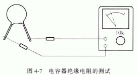 這種方法適用于無極性電容器絕緣電阻的測量。測量時將萬用表電阻擋置于10kΩ 擋,將兩只表筆分別接電容器的兩個引腳,如圖4-7 所示。對于一般小電容量的電容器,此時測得的電阻值應(yīng)為無窮大或接近無窮大;對于容量較大的電容器,萬用表指針會先沿順時針方向擺動一下,然后會很快指向無窮大。如果測得的電阻值小于1MΩ,說明電容器漏電嚴(yán)重或介質(zhì)有損壞現(xiàn)象,電容器不能使用。